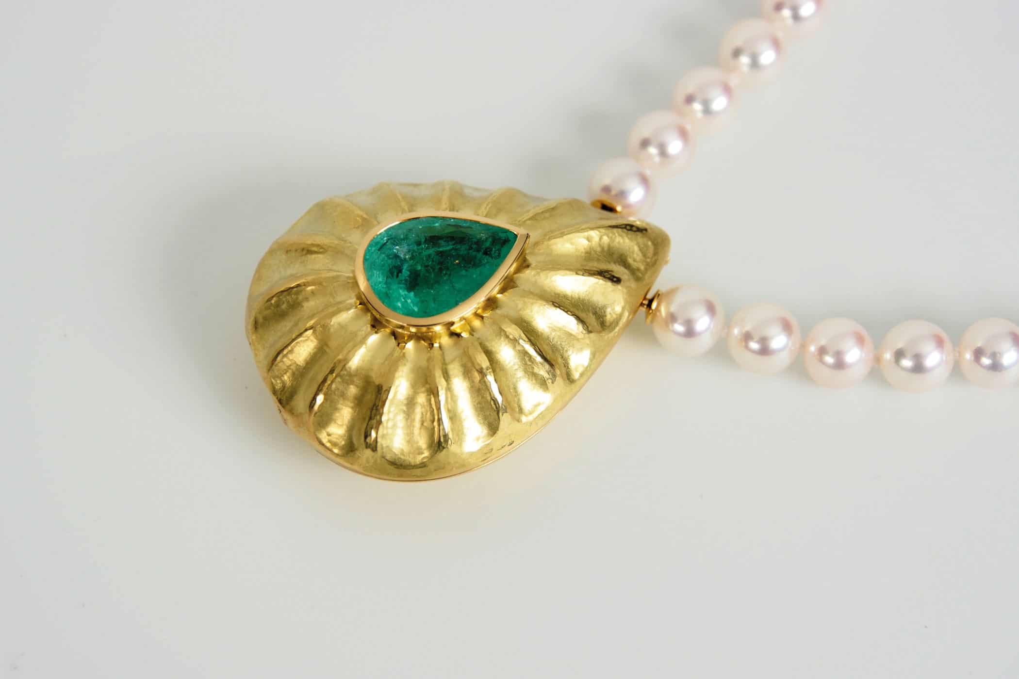 Ziselierter Anhänger aufklappbar als Verschluss mit Paraibaturmalintropfen und Akoyazuchterlenkette