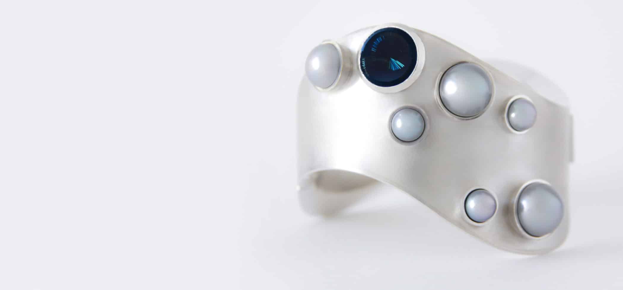 Katharina Kraus — In alle Richtungen asymmetrischer Armreif aus Silber, Weißgold mit Süßwasserperlen und Topas behandelt, geschmiedet und montiert