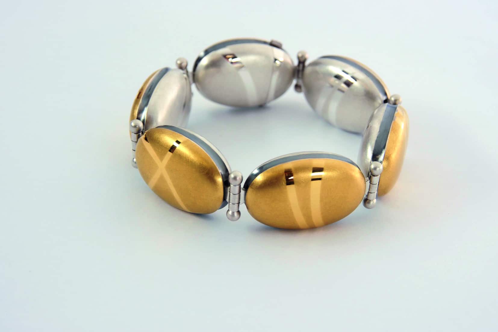 Sunke Kosack — Collier auch als Armband beidseitig tragbar, Weiß- Gelbgold und Silber, mit zwei Verschlüssen.